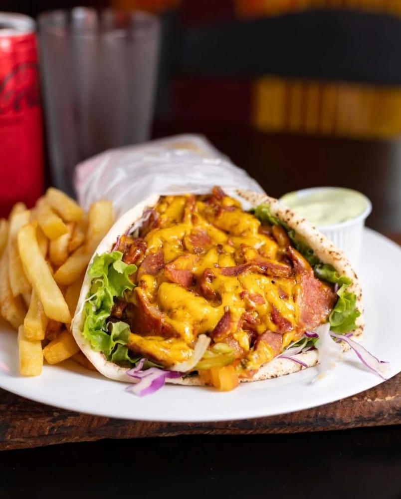Pão Sirio,Strogonoff de frango,maionese de alho,alface,repolho,tomate,cebola,salsa e batata Palha